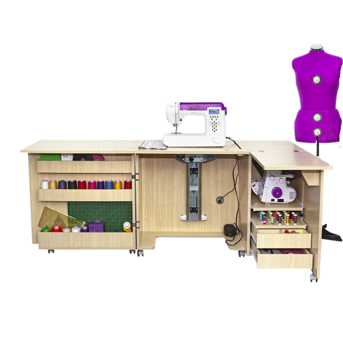 Rozkładana szafka zapewnia funkcjonalną przestrzeń do przechowywania maszyny wieloczynnościowej, overlocka i akcesoriów krawieckich