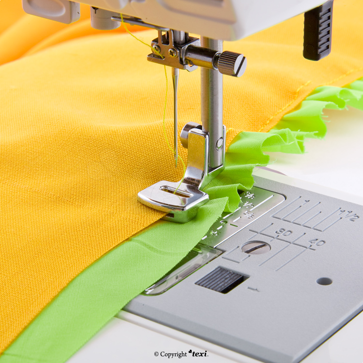 Foot for simultaneous shirring the bottom layer of material and sewing the upper layer with guiding of its edge. Perfect for frills, ruffles etc.