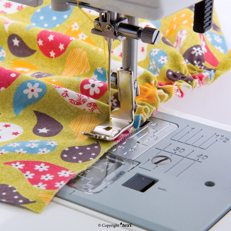 Single layer fabric shirring foot. Suitable for most of household sewing machines (Janome, Texi, Bernina, Brother, Łucznik, Elna, Toyota, Husqvarna etc.) with shuttle hook. Matches sewing machines with low attachment.