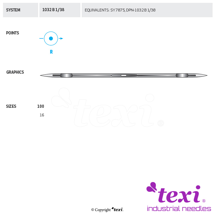 Product code TEXI 1032 B 1/38 100 Category Needles for industrial sewing machines