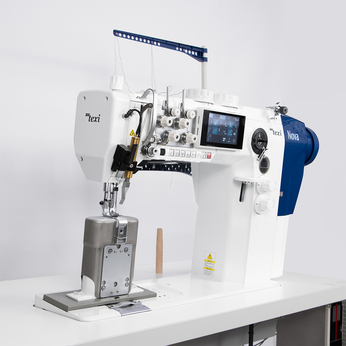 TEXI NOVA P-OS 3212 to automatyczna stebnówka słupkowa 2-igłowa z potrójnym transportem do bardzo grubych materiałów z funkcją ściegu ozdobnego i regulowaną wysokością kroczenia stopek.