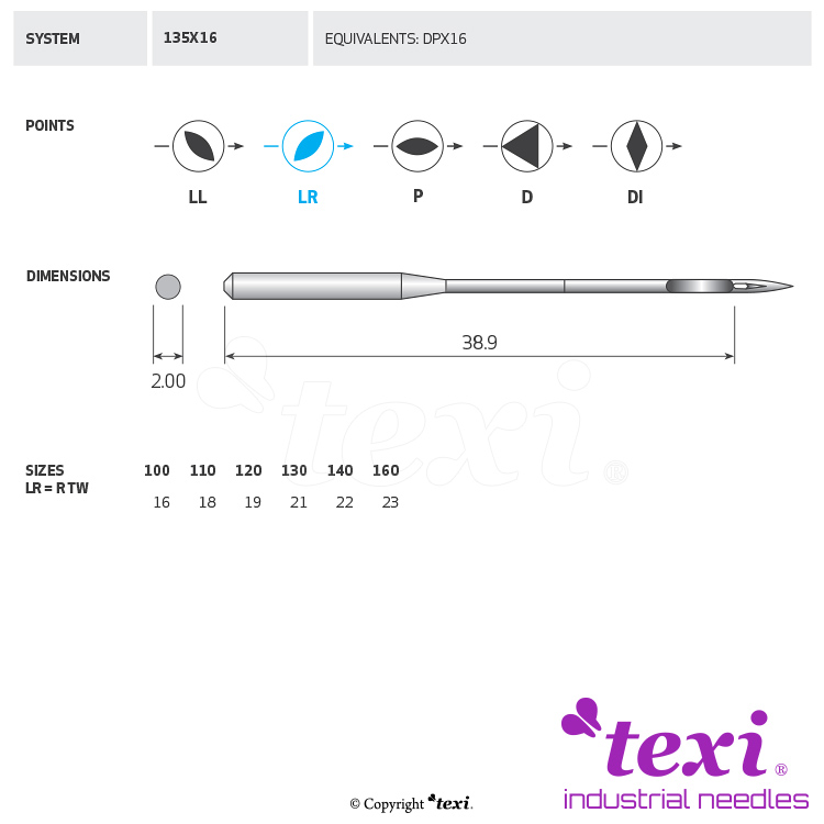 Product code TEXI 135X16 R TW 130 Category Needles for industrial sewing machines