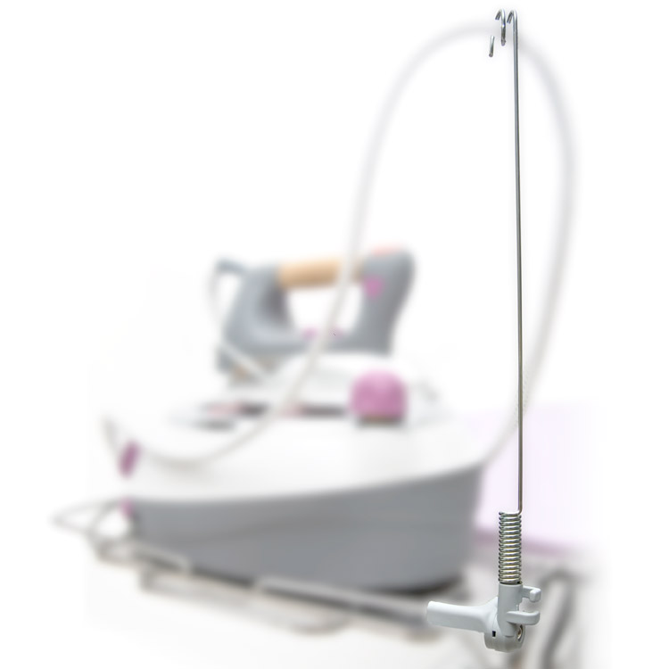 Iron cable holder with snap hook for ironing tables, board type. Perfect for Texi Champion, Battistella T220P and Tecnostir. Holder height 44 cm. Equipped with movable head which allows holder folding and easy table transporting. Ensures work comfort, improves iron handling and prevents cable twisting.