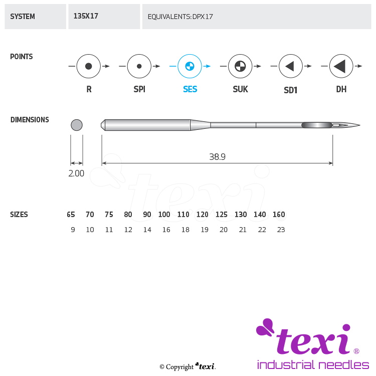 Product code TEXI 135X17 SES 110 Category Needles for industrial sewing machines