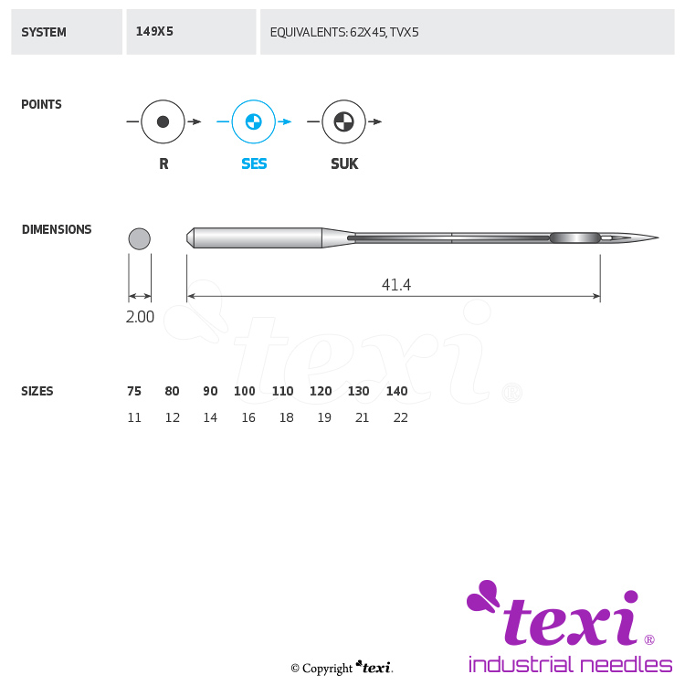 Product code TEXI 149X5 SES 110 Category Needles for industrial sewing machines