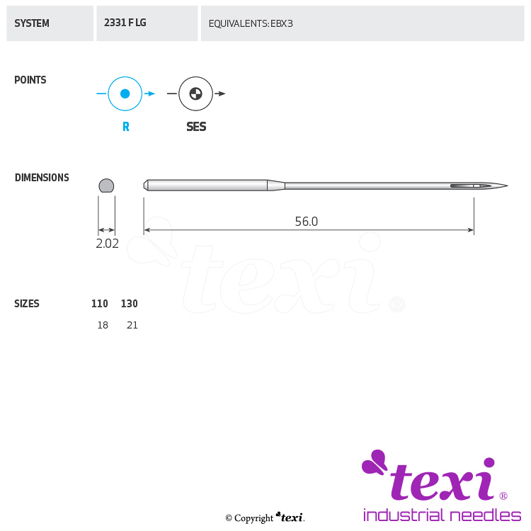 Product code TEXI 2331 F LG 110 Category Needles for industrial sewing machines
