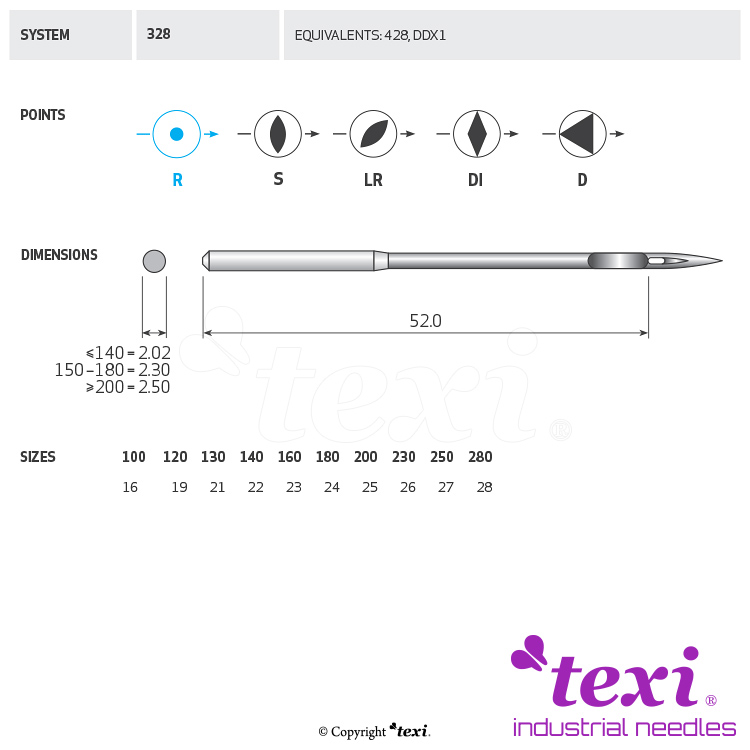 Product code TEXI 328 (R) 250 Category Needles for industrial sewing machines