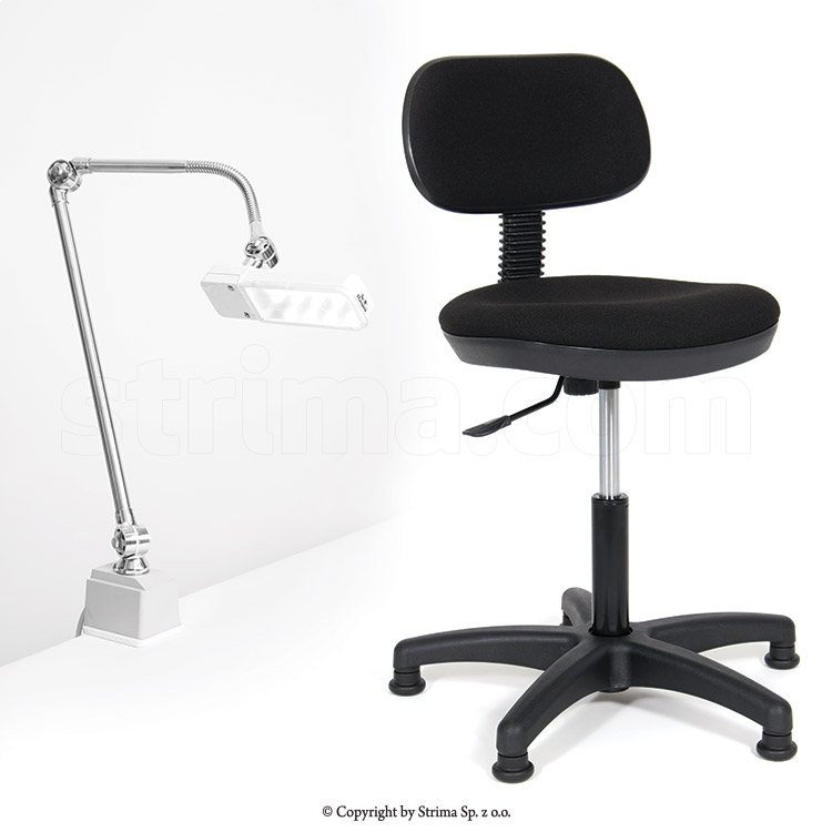 Wygodny komplet do pracowni krawieckiej: Ergonomiczne, tapicerowane krzesło i lampa LED do maszyny do szycia.
