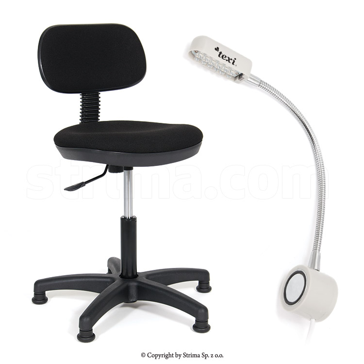Praktyczny zestaw wyposażenia do pracowni krawieckiej: profesjonalne krzesło tapicerowane i lampka led do maszyny do szycia.