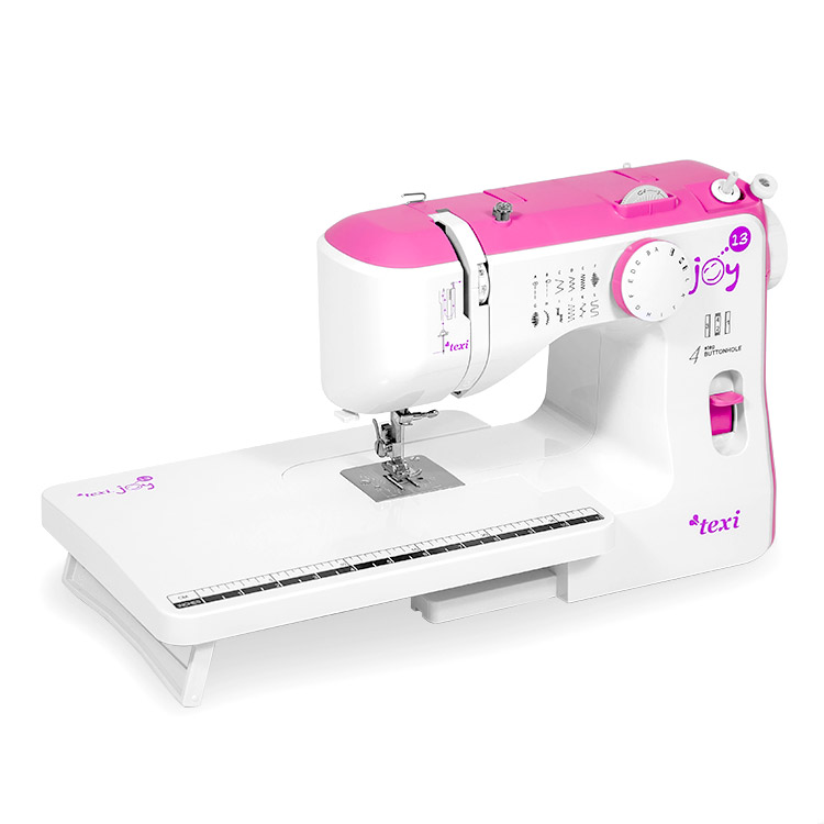 TEXI JOY 13 PINK + EXTENSION TABLE to wieloczynnościowa maszyna do szycia domowego ze stolikiem powiększającym. Maszyna do szycia szczególnie polecana do nauki szycia.