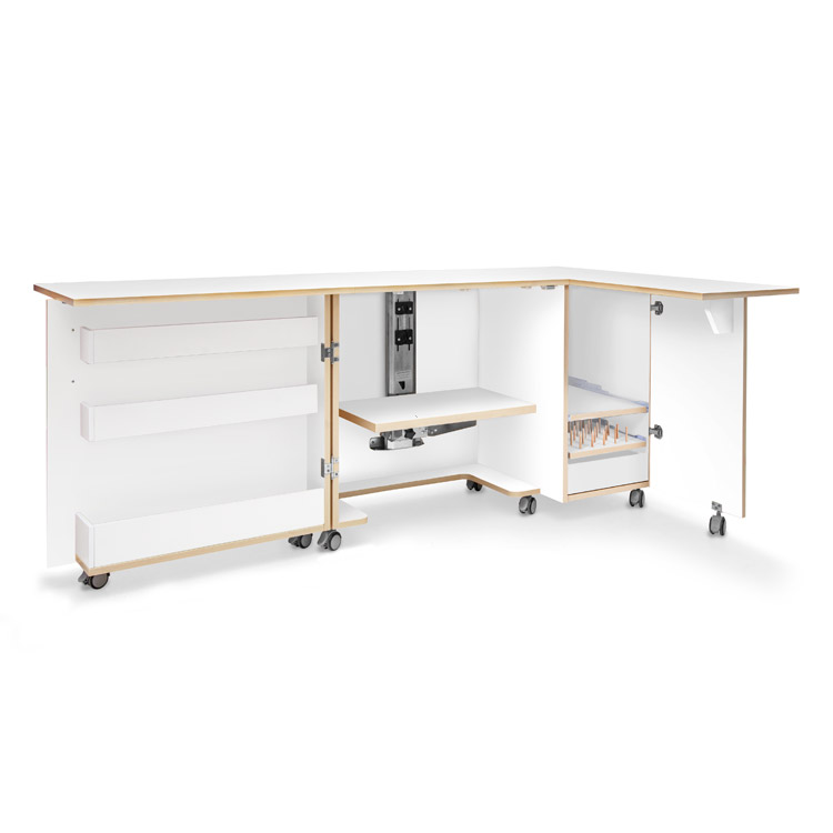 Od teraz możesz mieć wszystko, co potrzebne do szycia pod ręką. Kiedy nie używasz maszyny do szycia, za pomocą kilku ruchów schowasz wszystko i masz uporządkowaną przestrzeń.