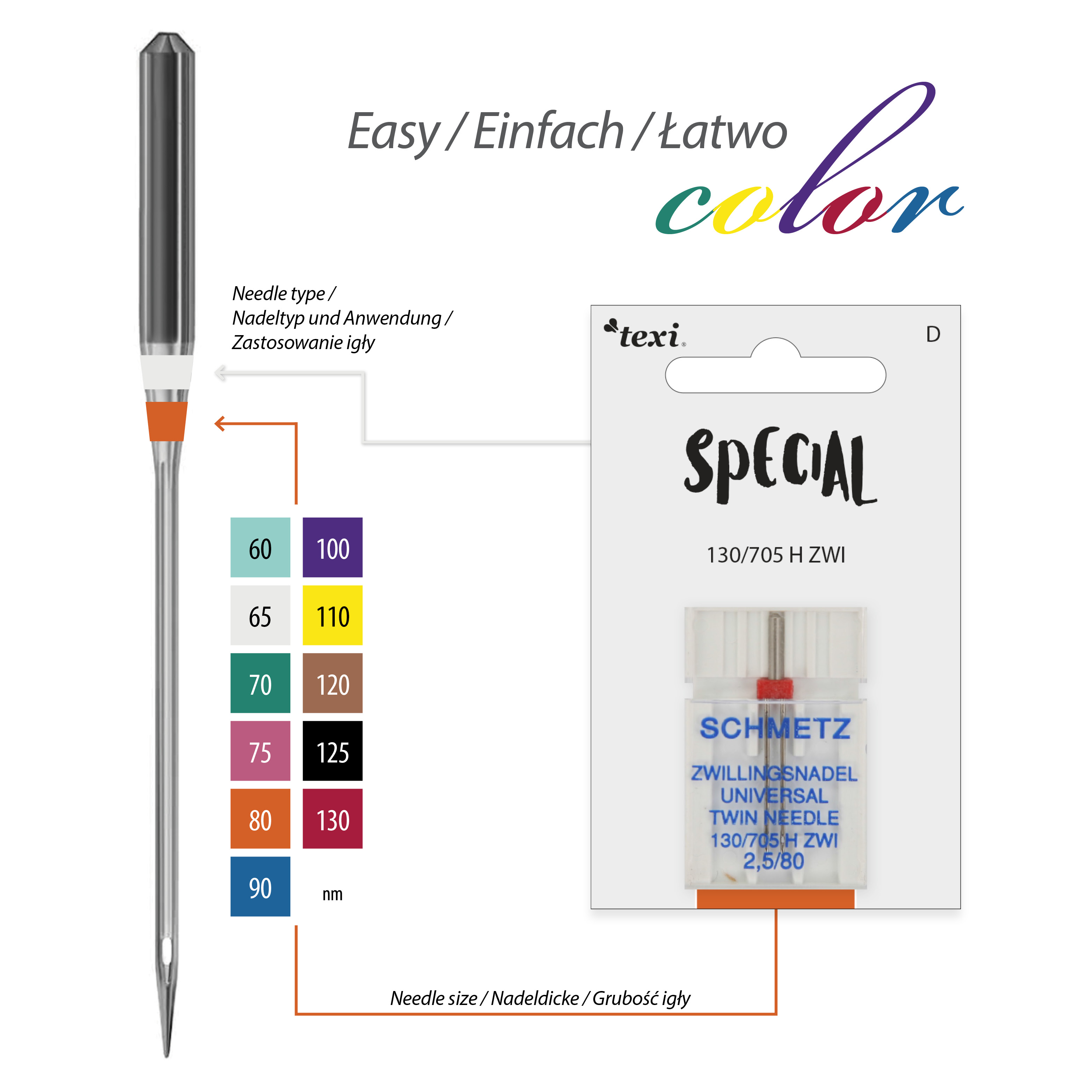 |TEXI UNI TWIN 130/705 H ZWI NE 2,0 80 Igły do ściegu ozdobnego do maszyn domowych, para, grubość 80, rozstaw 2,0 mm Cena:8,09 zł Dodaj do koszyka