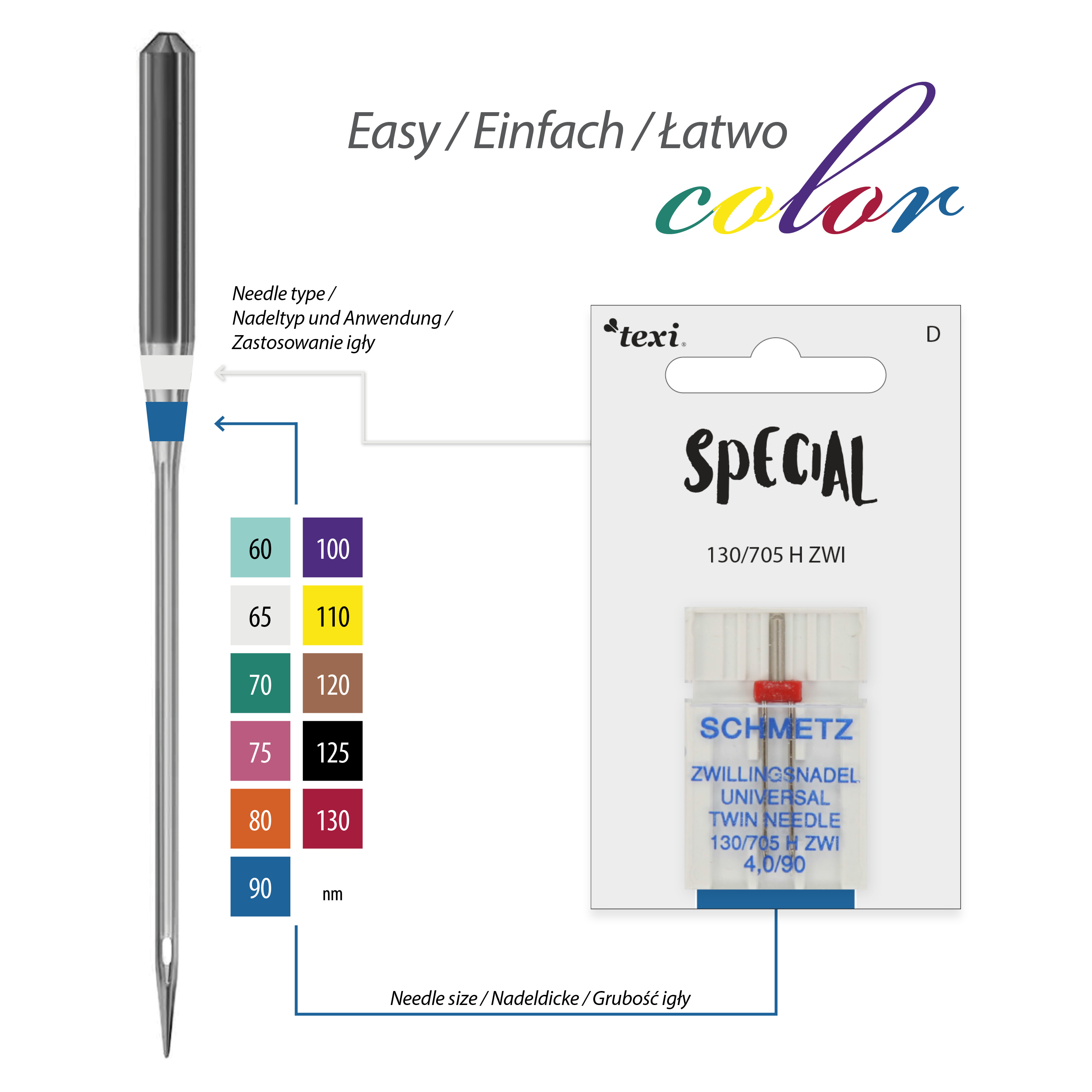 |TEXI UNI TWIN 130/705 H ZWI NE 3,0 90 Igły do ściegu ozdobnego do maszyn domowych, para, grubość 90, rozstaw 3,0 mm Cena:8,22 zł Dodaj do koszyka